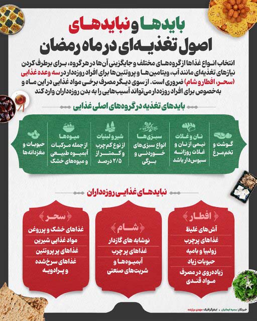 کیوسک خبر، رعایت اصول تغذیهای در ماه رمضان نقشی کلیدی در حفظ سلامت روزهداران دارد. کارشناسان تغذیه بر مصرف متعادل گروههای غذایی اصلی در وعدههای سحر، افطار و شام برای تامین آب، ویتامینها و پروتئین مورد نیاز بدن تاکید میکنند. در مقابل، پرهیز از برخی مواد غذایی که میتوانند منجر به مشکلات گوارشی یا ضعف […]
