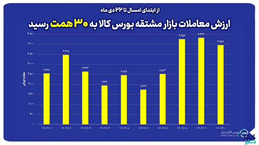 ارزش معاملات بازار قراردادهای آتی و اختیار معامله بورس کالای ایران از ابتدای سال جاری تا پایان روز معاملاتی منتهی به ۲۲ دی ماه ۱۴۰۳ به ترتیب ۲۹،۶۹۴ و ۱۴۳ میلیارد تومان بوده است.