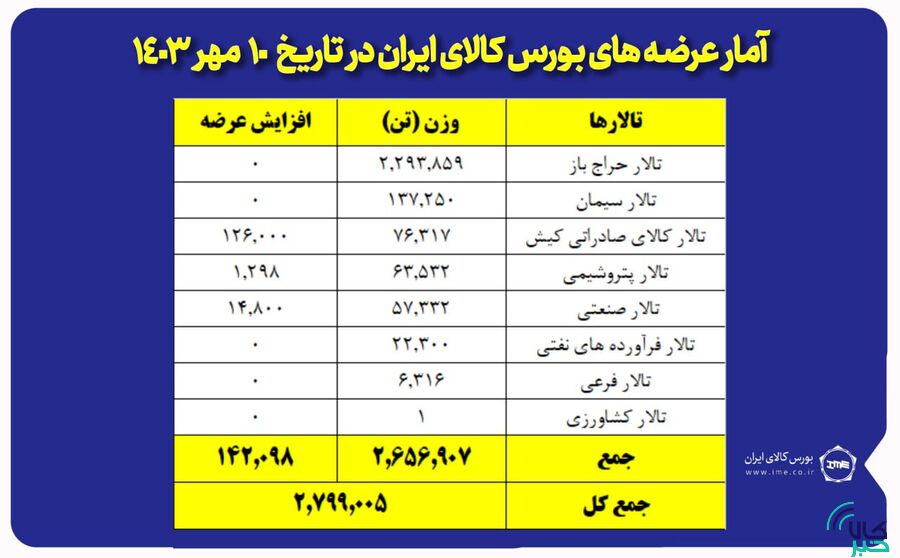 تالارهای بورس کالای ایران روز سهشنبه ۱۰ مهر ماه میزبان عرضه ۲ میلیون و ۷۹۹ هزار و ۴ تن کالا و محصول هستند که از این میزان ۶۴ هزار و ۸۲۹ تن محصول در تالار پتروشیمی و ۲۲ هزار و ۳۰۰ تن در تالار فرآوردهای نفتی روی تابلو می رود.