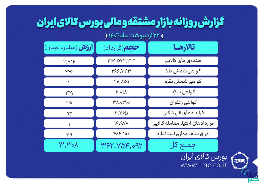 روز گذشته در بازار مشتقه و مالی بورس کالای ایران در مجموع بیش از ۳۶۲ میلیون و ۷۵۴ هزار قرارداد به ارزش ۳ هزار و ۳۰۸ میلیارد تومان منعقد شد.