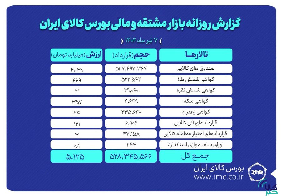 روز گذشته در بازار مشتقه و مالی بورس کالای ایران در مجموع بیش از ۵۲۸ میلیون و ۳۴۵ هزار قرارداد به ارزش ۵ هزار و ۱۲۵ میلیارد تومان منعقد شد.