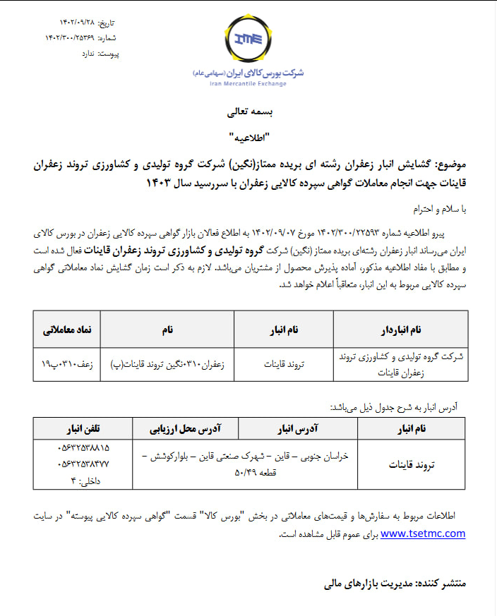 به گزارش کیوسک خبر به نقل از کالاخبر ، براساس جدیدترین اطلاعیه مدیریت بازارهای مالی بورس کالای ایران انبار زعفران رشته ای بریده ممتاز (نگین) گروه تولیدی و کشاورزی تروند زعفران قاینات فعال شده و با نماد معاملاتی زعف۰۳۱۰پ۱۹ و نام زعفران ۰۳۱۰ نگین تروند قاینات آماده پذیرش محصول مشتریان است.