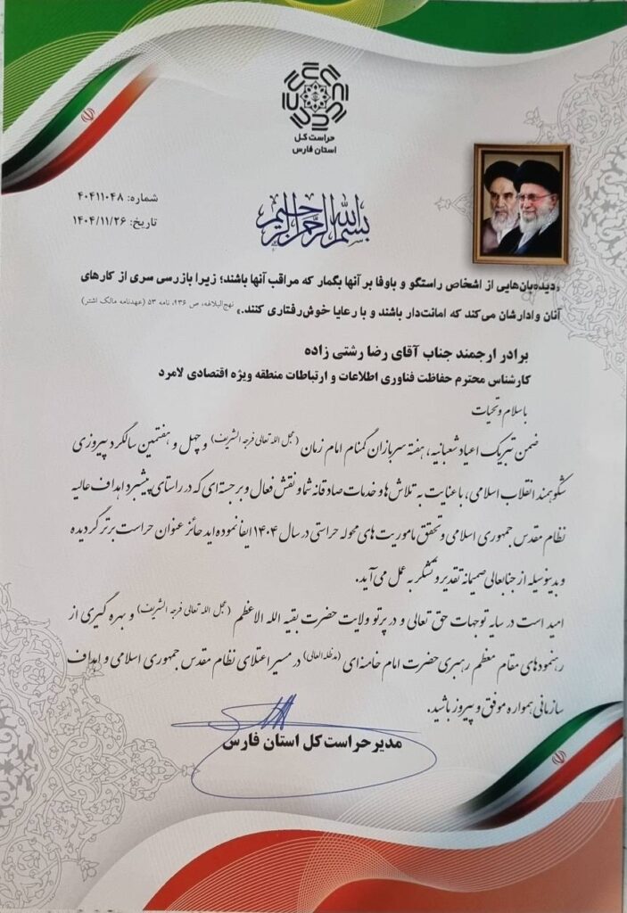 در ارزیابی جامع عملکرد حراستهای دستگاههای اجرایی استان فارس، حراست منطقه ویژه اقتصادی لامرد موفق به کسب عنوان «حراست برتر سال ۱۴۰۴ در حوزه فناوری اطلاعات (IT)» شد.