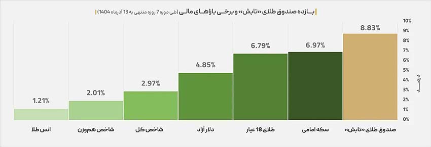 صندوق طلای تابان تمدن با نماد «تابش» در هفته منتهی به ۱۳ آذرماه ۱۴۰۴ با ثبت بازدهی چشمگیر ۸.۸۳ درصدی و عبور ارزش داراییهای خود از مرز ۱۱ همت، توانست عملکردی بالاتر از بازارهای موازی از جمله سکه امامی، طلای ۱۸ عیار و دلار آزاد به ثبت برساند.