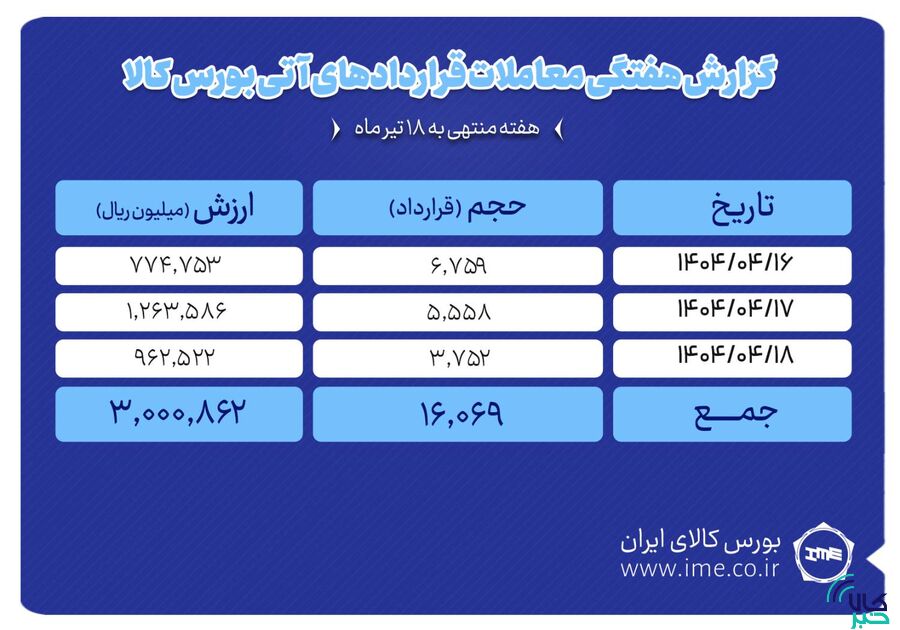 به گزارش کیوسکخبر به نقل از کالاخبر ،در هفته گذشته ۱۶ هزار و ۶۹ قراردادآتی به ارزش ۳۰۰ میلیارد تومان منعقد شد. در هفته گذشته بیشترین حجم و ارزش معامله به روز ۱۶ تیر ماه اختصاص یافت به طوری که در این روز بیش از ۶ هزار و ۷۵۹ قرارداد منعقد شد و ارزش معاملات نیز به بیش از ۷۷.۴ میلیارد تومان رسید.