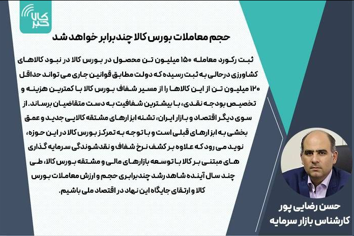 عبور حجم معاملات بورس کالای ایران از ۱۵۰ میلیون تن در سال ۱۴۰۲ را به فال نیک می گیریم اما باید توجه کرد که ثبت این رکورد در نبود کالاهای کشاورزی به ثبت رسیده که دولت مطابق قوانین جاری می تواند حداقل ۱۲۰ میلیون تن از این کالاها را از مسیر شفاف بورس کالا با کمترین هزینه و تخصیص بودجه نقدی، با بیشترین شفافیت به دست متقاضیان برساند. از سوی دیگر اقتصاد و بازار ایران، تشنه ابزارهای مشتقه کالایی جدید و عمق بخشی به ابزارهای قبلی است و با توجه به تمرکز بورس کالا در این حوزه، نوید می رود که علاوه بر کشف نرخ شفاف و نقدشوندگی سرمایه گذاری های مبتنی بر کالا با توسعه بازارهای مالی و مشتقه بورس کالا، طی چند سال آینده شاهد رشد چندبرابری حجم و ارزش معاملات بورس کالا و ارتقای جایگاه این نهاد در اقتصاد ملی باشیم.