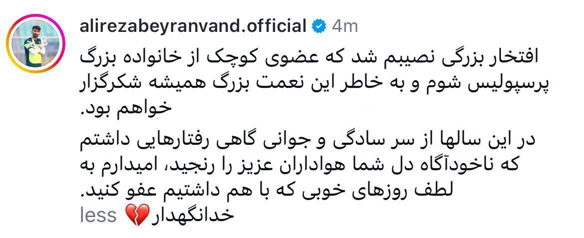 بیرانوند در پست خود نوشت: افتخار بزرگی نصیبم شد که عضوی کوچک از خانواده بزرگ پرسپولیس شوم و به خاطر این نعمت بزرگ همیشه شکرگزار خواهم بود.