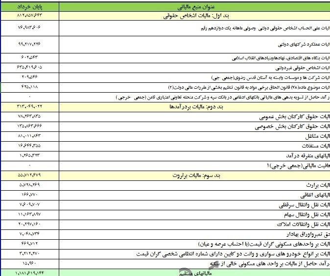 بر همین مبنا تا پایان خرداد ماه ۸۱ هزار و ۲۸۵ میلیارد تومان مالیات از محل مالیات اشخاص حقوقی، ۳۱ هزار و ۳۰۴ میلیارد تومان از محل مالیات بر درآمد و ۵ هزار و ۵۷۱ میلیارد تومان از محل مالیات بر ثروت وصول شده است.