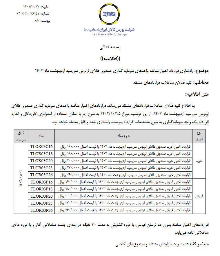بورس کالا با صدور اطلاعیه ای از راه اندازی قرارداد اختیار معامله واحدهای سرمایه گذاری صندوق طلای لوتوس با سررسید اردیبهشت ۱۴۰۳ از روز دوشنبه ۲۵ دی ماه با امکان استفاده از استراتژی کاوردکال خبر داد.