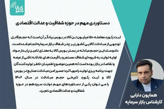 دادوستد این حجم مبادله در بستر بورس کالا به معنای تامین پایدار مواد اولیه تولید به شیوه ای شفاف، مستمر و با قیمت های عادلانه ناشی از عرضه و تقاضا در بازار بوده است که همین موضوع اطمینان خاطر تولیدکنندگان جهت برنامه ریزی تولید را مهیا کرد؛ مسیر امن مبادلات صنایع در بورس کالا و ثبت رکورد تاریخی حجم مبادلات در سال ۱۴۰۲ را می توان یکی از دستاوردهای مهم دولت سیزدهم در حوزه شفافیت و عدالت اقتصادی نام برد.