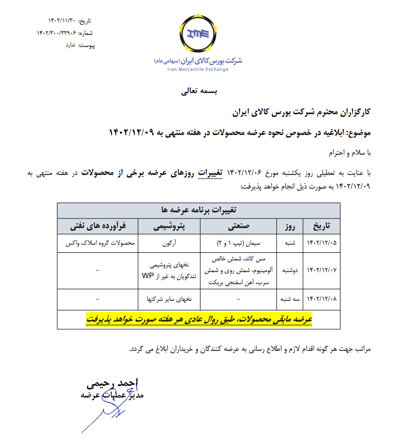 در ادامه این نامه آمده است، عرضه مابقی محصولها طبق روال عادی هر هفته صورت میپذیرد.