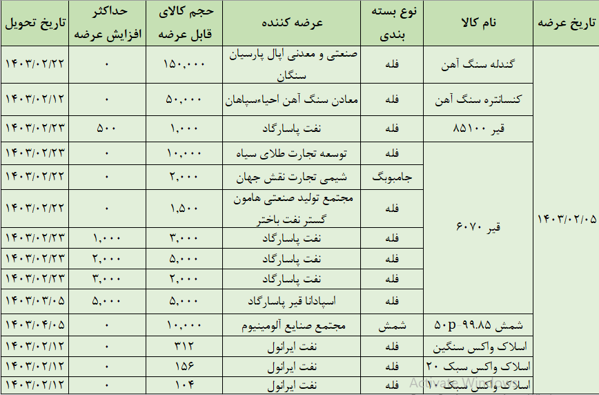 به گزارش کالاخبر ،به این ترتیب روز چهارشنبه در تالار صادراتی بورس کالای ایران ۱۵۰ تن گندله سنگ آهن،۵۰ هزار تن کنسانتره، ۲۹ هزار و ۵۰۰ تن قیر، ۱۰ هزارتن شمش آلومینیوم و ۵۷۲ تن اسلاک واکس عرضه می شود.