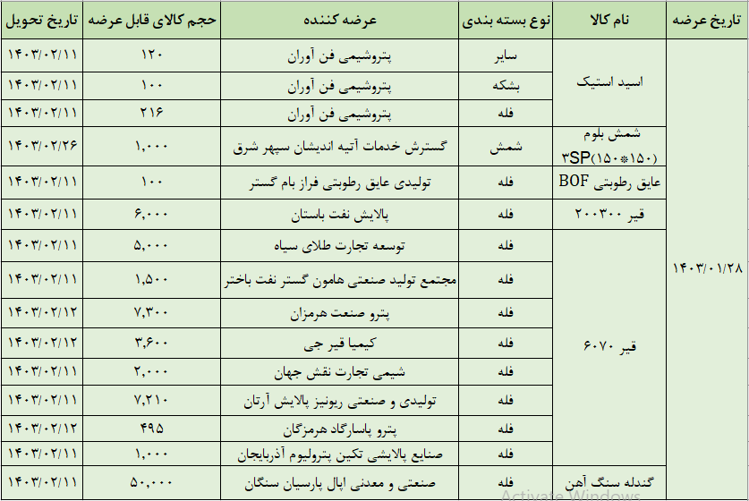 به گزارش کیوسک خبر به نقل از کالاخبر ،به این ترتیب روز سه شنبه در تالار صادراتی بورس کالای ایران ۴۳۶ تن اسید استیک، هزار تن شمش بلوم،۱۰۰ تن عایق رطوبتی، ۳۴ هزار و ۱۰۵ تن قیر و ۵۰ هزار تن گندله سنگ آهن عرضه می شود.