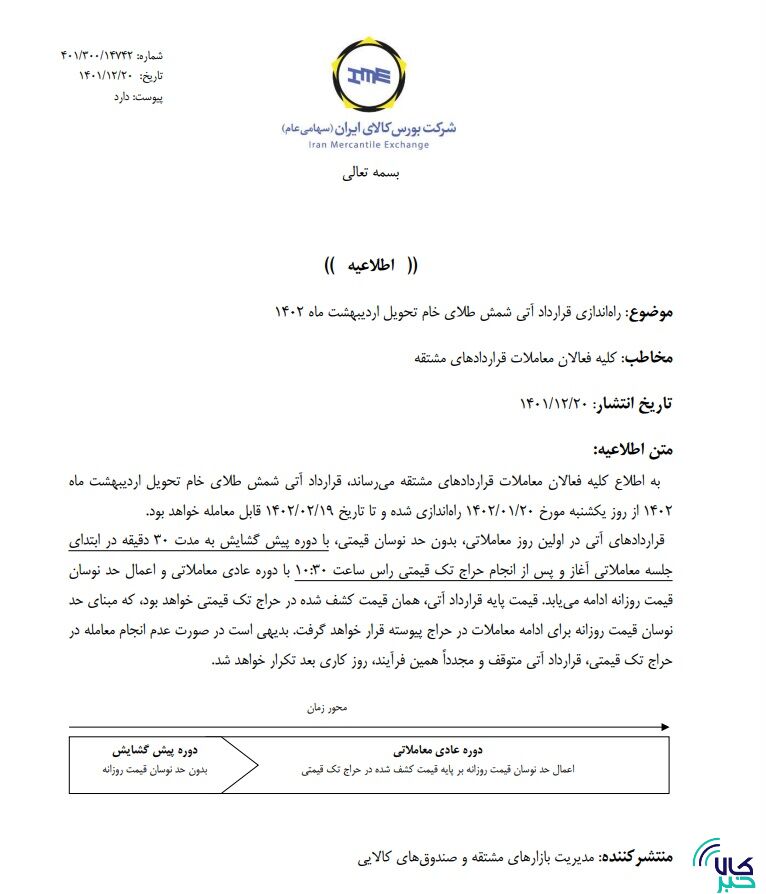 بورس کالای ایران در راستای تحقق رسالت خود در جهت توسعه ابزارهای مشتقه، اطلاعیه راه اندازی قراردادهای آتی شمش طلا را روز جاری به مورخ ۲۰/۱۲/۱۴۰۱ منتشر کرد و براساس این اطلاعیه معاملات این ابزار از تاریخ ۲۰ فرودین ۱۴۰۲ آغاز خواهد شد.