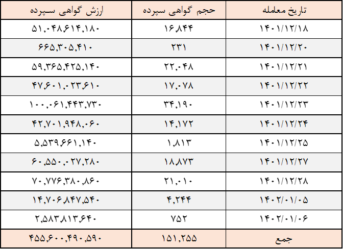 از ۱۸ تا ۲۸ اسفند ۱۴۰۱ نیز درمجموع ۱۴۶ هزار و ۲۵۹ گواهی معادل ۱۴ کیلو و ۶۲۵ گرم شمش مورد معامله قرار گرفت که ارزشی بالغ بر ۴۳.۸ میلیارد تومان داشت.