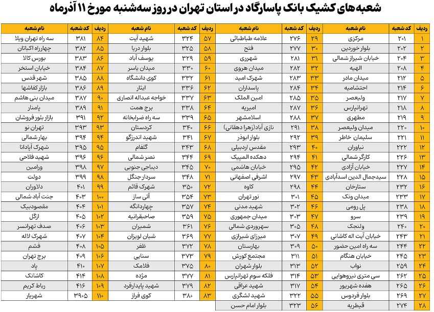 به اطلاع مشتریان ارجمند میرساند، با توجه به تداوم آلودگی هوا و بر اساس تصمیم استانداری تهران و ابلاغیه کانون بانکها و مؤسسات اعتباری خصوصی، ارائه خدمات به مشتریان گرامی در روز سهشنبه، ۱۱ آذرماه ۱۴۰۴، از طریق شعبههای کشیک و در بازه زمانی ۷:۳۰ الی ۱۳:۳۰ انجام خواهد شد. بدینوسیله فهرست شعبههای کشیک بانک پاسارگاد در استان تهران برای روز سهشنبه ۱۱ آذرماه به شرح زیر اعلام میگردد.