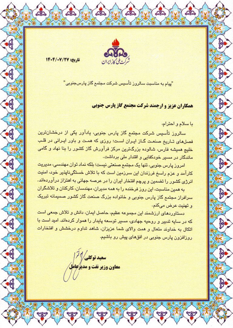 سعید توکلی، معاون وزیر نفت و مدیرعامل شرکت ملی گاز ایران، طی پیامی سالروز تأسیس شرکت مجتمع گاز پارس جنوبی را به تمامی تلاشگران سرافراز این مجتمع و خانواده بزرگ صنعت گاز تبریک گفت.