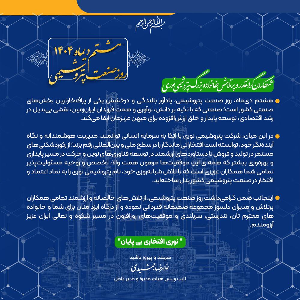 اینجانب ضمن گرامیداشت روز صنعت پتروشیمی از تلاشهای خالصانه و ارزشمند تمامی همکاران پرتلاش و مدیران دلسوز مجموعه صمیمانه قدردانی نموده و از درگاه ایزد منان برای شما و خانواده های محترمتان تندرستی سربلندی و موفقیتهای روزافزون در مسیر شکوه و تعالی ایران عزیز آرزومندم.