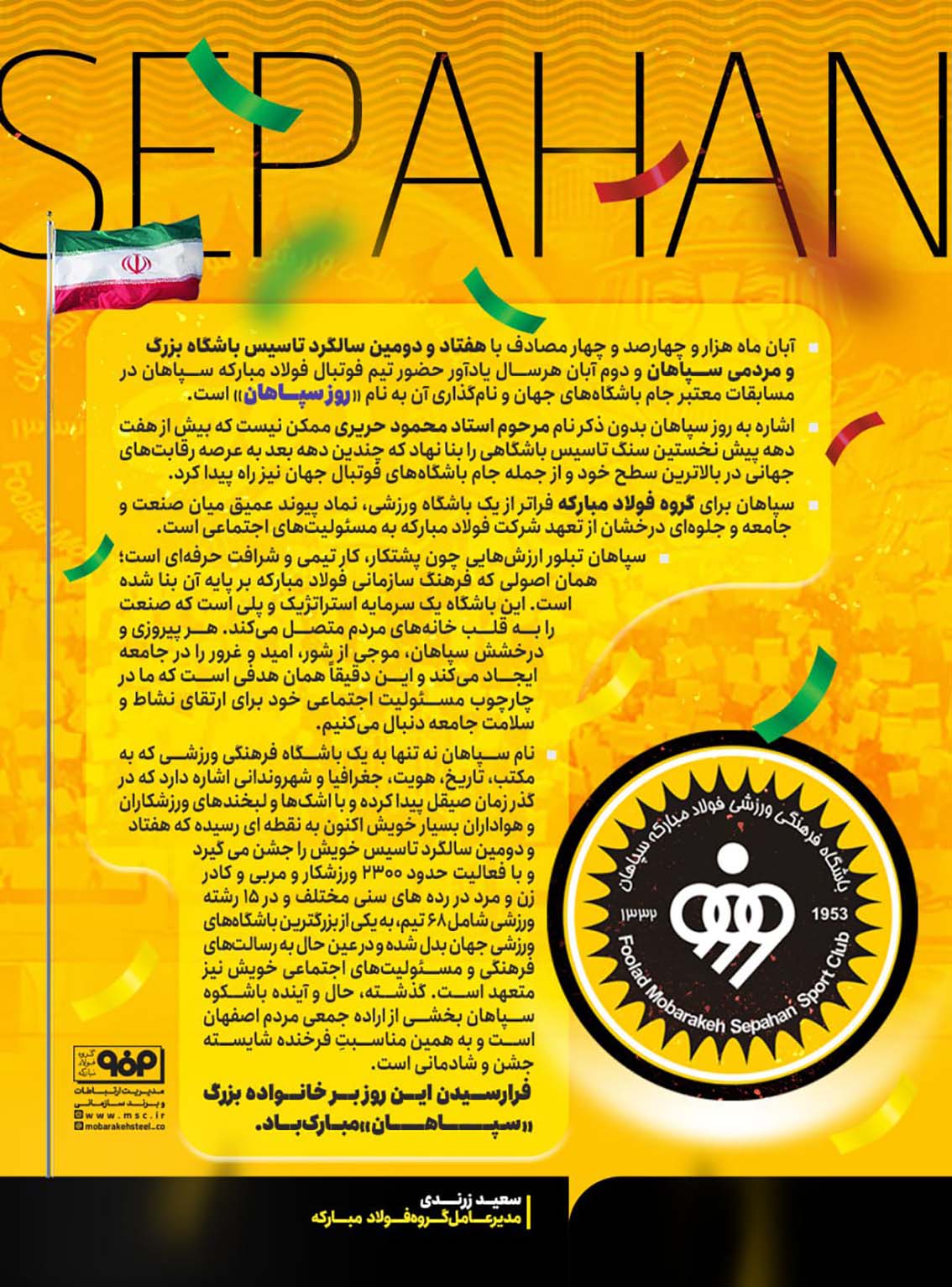 نام سپاهان نه تنها به یک باشگاه فرهنگی ورزشی که به مکتب، تاریخ، هویت، جغرافیا و شهروندانی اشاره دارد که در گذر زمان صیقل پیدا کرده و با اشکها و لبخندهای ورزشکاران و هواداران بسیار خویش اکنون به نقطه ای رسیده که هفتاد و دومین سالگرد تاسیس خویش را جشن می گیرد و با فعالیت حدود ۲۳۰۰ ورزشکار و مربی و کادر زن و مرد در رده های سنی مختلف و در ۱۵ رشته ورزشی شامل ۶۸ تیم، به یکی از بزرگترین باشگاههای ورزشی جهان بدل شده و در عین حال به رسالتهای فرهنگی و مسئولیتهای اجتماعی خویش نیز متعهد است. گذشته، حال و آینده باشکوه سپاهان بخشی از اراده جمعی مردم اصفهان است و به همین مناسبتِ فرخنده شایسته جشن و شادمانی است.