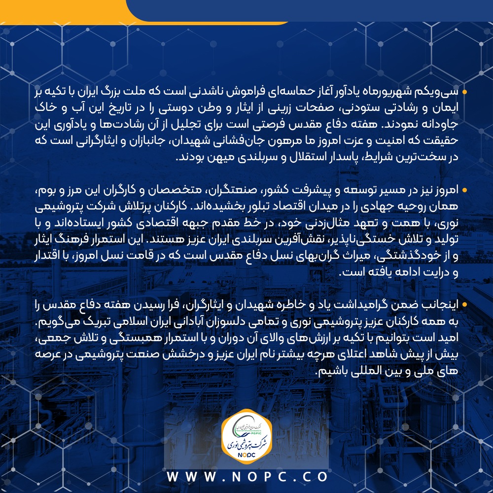 بسم الله الرحمن الرحیمهمکاران گرانقدر و خانواده ی بزرگ پتروشیمی نوریچهل و شش سال از پیروزی شکوهمند مردم سربلند و شریف ایران اسلامی بر استبداد خودکامگی و ظلم سازمان یافته ی بین المللی در حق این آب و خاک مقدس میگذرد پیروزی عظیمی که ایران عزیز را به تاریخی جدید برای نقش آفرینی موثر و […]