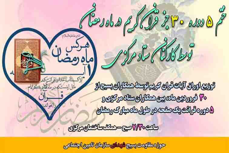 فرمانده حوزه مقاومت بسیج شهدای سازمان تأمین اجتماعی گفت: در ماه مبارک رمضان 5 دوره ختم قرآن کریم به نیت سلامتی امام زمان (عج) و خانواده همکاران توسط کارکنان ستاد مرکزی سازمان تلاوت میشود.