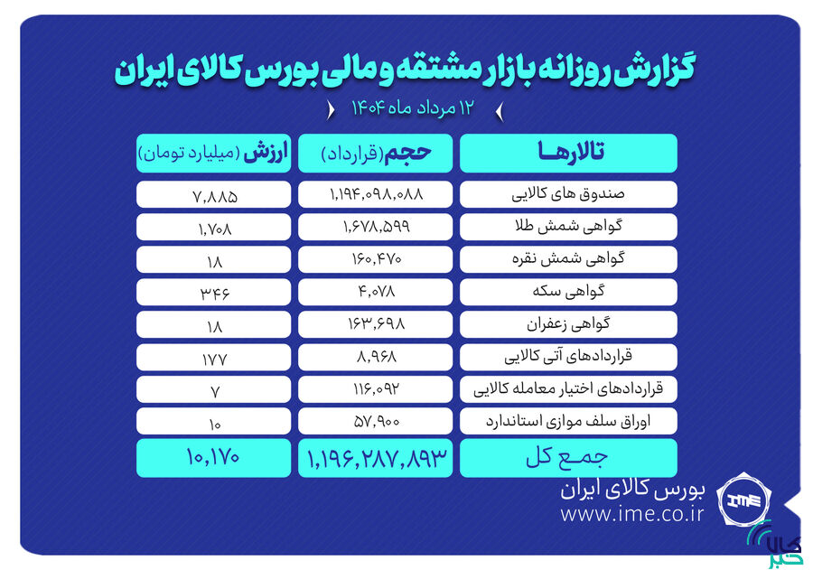 روز گذشته در بازار مشتقه و مالی بورس کالای ایران در مجموع بیش از یک میلیارد و ۱۹۶ میلیون و ۲۸۷ هزار و ۸۹۳ قرارداد به ارزش ۱۰ هزار و ۱۷۰میلیارد تومان منعقد شد. به گزارش کیوسکخبر به نقل از کالاخبر ،در دادوستدهای روزگذشته بازار گواهی سپرده کالایی یک میلیون و ۶۷۸ هزار و ۵۹۹ […]